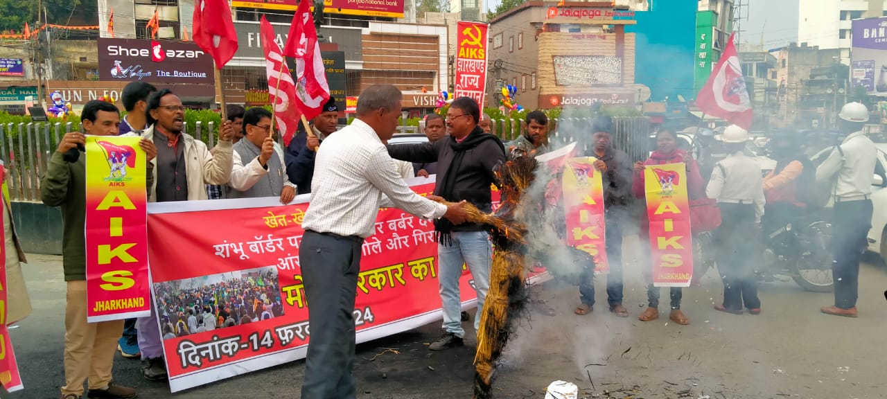 किसान मोर्चा झारखंड के तत्वावधान में किसान आन्दोलन में किसानों पर बर्बर लाठीचार्ज,रबर बुलेट,व किसान नेताओं की गिरफ्तारी के खिलाफ एलवर्ट एक्का चौक रांची में मोदी सरकार का पूतला दहन किया गया। अन्नदाता किसानों पर दमन नहीं चलेगा, किसानों पर लाठीचार्ज,रबर बुलेट चलाने वाली मोदी सरकार हाय हाय, किसानों के फसलों के लिए एम्, एस, पी ,का कानून बनाना होगा,16 फरवरी को ग्रामीण भारत बंद व औद्योगिक हड़ताल रहेगा ।