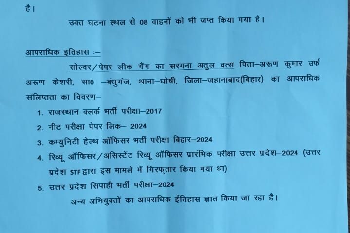 प्राथमिक जांच में यह भी सामने आया है कि इस गिरोह का संबंध पहले भी कई बड़े पेपर लीक मामलों से रहा है, जिनमें नीट 2024, यूपी पुलिस भर्ती 2024 और अन्य परीक्षाएं शामिल हैं।