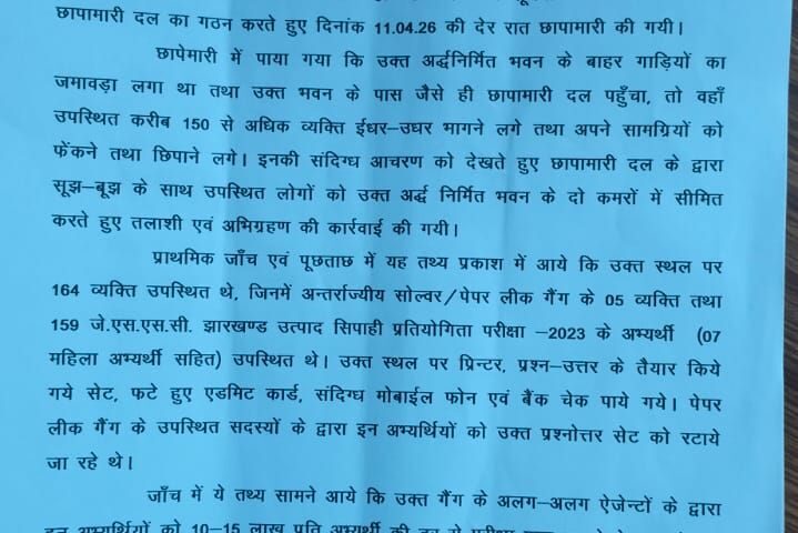 रांची | झारखंड में उत्पाद सिपाही प्रतियोगिता परीक्षा से पहले पेपर लीक का बड़ा मामला सामने आया है। रांची जिले के तमाड़ थाना क्षेत्र में पुलिस ने गुप्त सूचना के आधार पर एक बड़ी छापेमारी कर पूरे सॉल्वर/पेपर लीक गिरोह का भंडाफोड़ किया है।