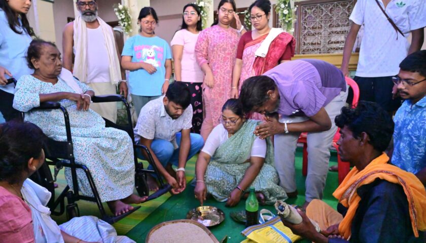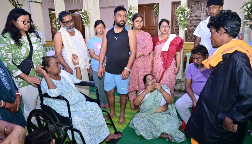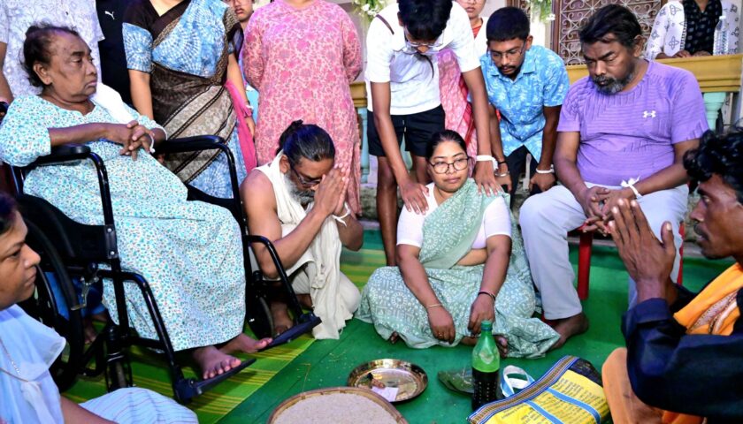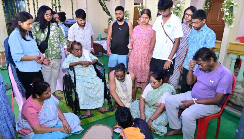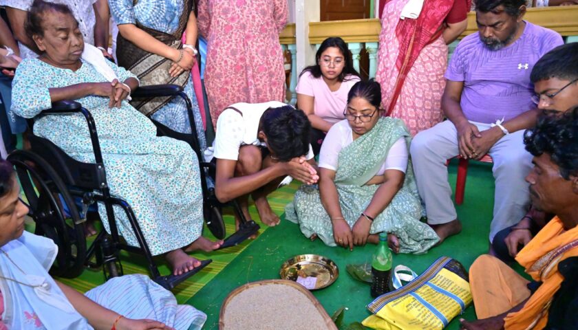 रूपी सोरेन व्हीलचेयर पर बैठी है। बाई तरफ कल्पना सोरेन और दाई ओर सीता सोरेन और हेमंत सोरेन तीन कर्म हो रहा है। संथाली परंपरा के मुताबिक कर्म हो रहा है। गुरु जी शिवू सोरेन जहां कहीं भी होंगे इस तस्वीर को देख मुस्कुरा तो जरूर रहे होंगे। उन्होंने ता उम्र अपने लंबे चौड़े परिवार को बचाने की कोशिश की थी।