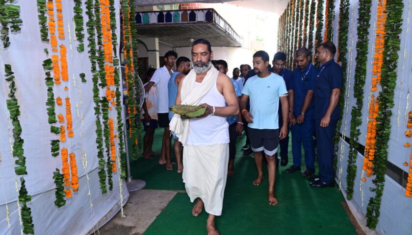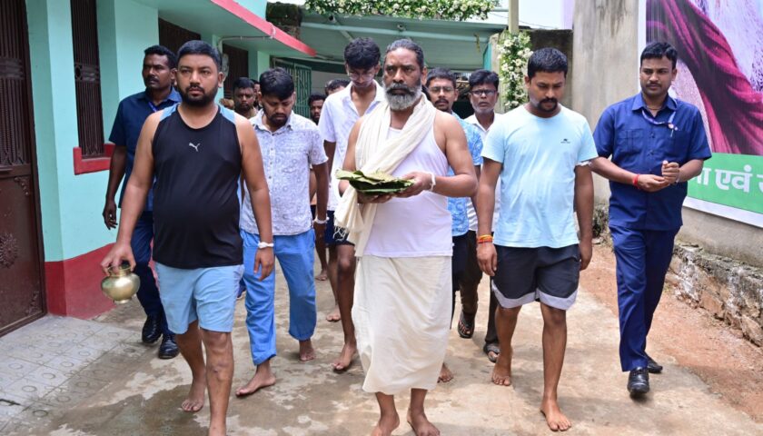शिबू सोरेन का पूरा परिवार एक आंगन में इकट्ठा है। अंतयष्टि के तीसरे दिन तीसरा कर्म निभाया जा रहा है। हेमंत सोरेन सखुआ के पत्ते को उठाकर घर से नंगे पांव निकलते हैं। बारिश की वजह से सड़कों पर कीचड़ है। फिर भी झारखंड का मुख्यमंत्री अपनी जिम्मेदारी को निभाने में कोई कसर छोड़ता हुआ नजर नहीं आता। वीर शिव सोरेन के जाने के बाद पैदा हुई शून्यता को महसूस करते हुए तालाब किनारे सखुआ के पत्ते को रखते हैं। फिर जल ढालते हैं। तीन दिन हो गए अंत्यष्टि के और चार दिन हुए आखिरी सांस लिए हुए। शिवू सोरेन का परिवार नेमरा में उन्हें जल जंगल जमीन में सौंपने के बाद धार्मिक परंपराओं में कमी नहीं रखने की पूरी कोशिश करता हुआ दिख रहा है।