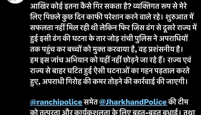 उन्होंने रांची पुलिस के साथ-साथ झारखंड पुलिस की पूरी टीम को उनकी तत्परता और कार्यकुशलता के लिए बधाई दी और बच्चों अंश व अंशिका के परिवार को हार्दिक शुभकामनाएं दीं।