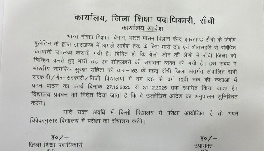 इसी के मद्देनज़र भारतीय नागरिक सुरक्षा संहिता की धारा-163 के तहत रांची जिला अंतर्गत संचालित सभी सरकारी, गैर-सरकारी एवं निजी विद्यालयों में KG से 12वीं तक की कक्षाओं का पठन-पाठन दिनांक 27 दिसंबर 2025 से 31 दिसंबर 2025 तक स्थगित किया गया है।