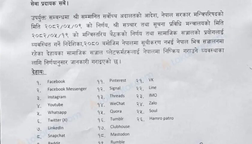 नेपाल सरकार ने आज एक महत्वपूर्ण फैसला लेते हुए 26 सोशल मीडिया प्लेटफॉर्म्स पर बैन लगा दिया है। इनमें फेसबुक, इंस्टाग्राम, एक्स (पूर्व में ट्विटर), यूट्यूब, व्हाट्सएप, टिकटॉक, लिंक्डइन, थ्रेड्स, मैसेंजर और अन्य प्रमुख ऐप्स शामिल हैं। यह प्रतिबंध मुख्य रूप से उन प्लेटफॉर्म्स पर लगाया गया है जो नेपाल में आधिकारिक रूप से रजिस्टर नहीं हुए हैं। नेपाल टेलीकम्युनिकेशन अथॉरिटी (NTA) ने इंटरनेट सर्विस प्रोवाइडर्स (ISP) को निर्देश दिया है कि वे इन प्लेटफॉर्म्स को ब्लॉक कर दें।