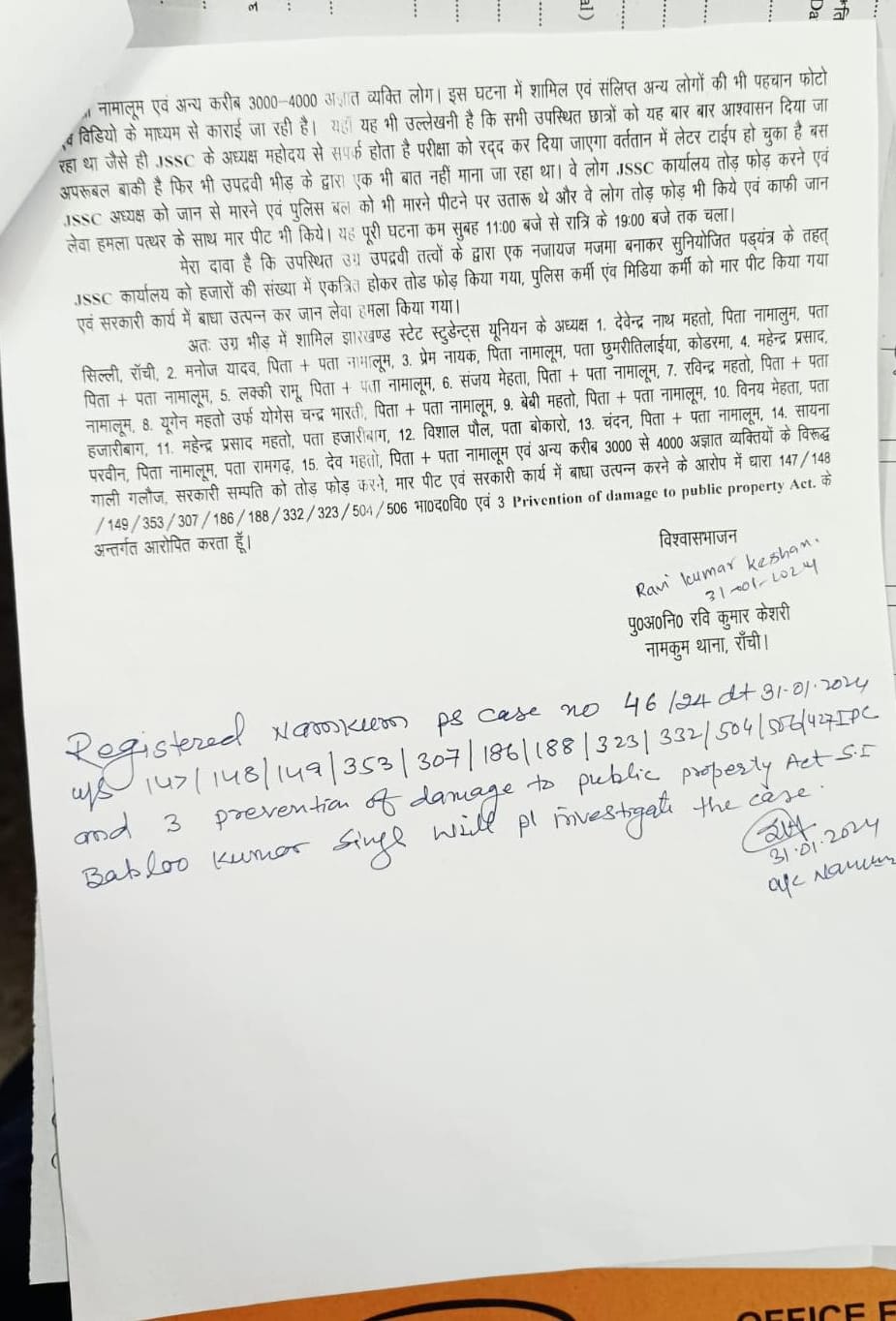 जेएसएससी सीजीएल पेपर लीक महाघोटाला के विरोध तथा 28 जनवरी के सभी पेपर रद्द एवम 4 फरवरी का परीक्षा को स्थगित कर जेएसएससी सीजीएल महाघोटाला का सीबीआई जांच, अध्यक्ष नीरज सिन्हा का स्थिफा, सीजीएल एग्जाम लेने वाले एजेंसी को ब्लैकलिस्टेड कर नई विश्वसनीय एजेंसी का टैंडर कर यथाशीघ्र परीक्षा घोषणा करने , और सीजीएल लेने वाले एजेंसी ही पीजीटी, नगरपालिका, लैब असिस्टेंट टेक्नीशियन का परीक्षा लिया हो तो उक्त परीक्षा का सीबीआई जांच का मांग को लेकर निरंतर चरणबद्ध आंदोलन के तीसरे दिन 31 जनवरी 2024 को जेएसएससी कार्यालय के समक्ष महाघेराव कर रहे छात्र झारखण्ड स्टेट स्टूडेंट्स यूनियन प्रमुख देवेन्द्र नाथ महतो, योगेश चन्द्र भारती, मनोज यादव, संजय मेहता, बेबी महतो, महेन्द्र प्रसाद, प्रेम नायक , लक्की रामू, चंदन, रविन्द्र महतो, विशाल पॉल, सायना प्रवीण , देव महतो, विनय मेहता, महेन्द्र प्रसाद महतो, समेत 3000-4000 छात्रों पर एफआईआर दर्ज किया गया। सभी पर अध्यक्ष नीरज सिन्हा को गाली गलौज, सरकारी संपत्ति को तोड़ फोड़ करने, मार पीट एवम् सरकारी कार्य में बाधा उत्पन्न करने के अलावा अन्य आरोप में आईपीसी धारा147/148/149/353/307/186/188/323/332/504/506/427 एवम् 3 प्रिवेंशन ऑफ डैमेज टू पब्लिक प्रॉपर्टी एक्ट के आरोपित बनाया गया है।