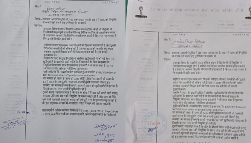 इस संदर्भ में ऐसे अनेक सुप्रीम कोर्ट के न्यायिक निर्णय है जो स्पष्ट करती है कि मेंस द्वारा नियुक्ति मे आरक्षित श्रेणी के अभ्यर्थी समान्य श्रेणी में जा सकता है । इन बातो से प्राथमिक शिक्षा निदेशक एवं शिक्षा सचिव झारखण्ड सरकार को साक्ष्यो के साथ 2/08/025 को विज्ञप्ति देकर अवगत कराया गया और सहायक आचार्य की नियुक्ति में JTET में 60% इत्यादि पर पुर्नविचार करने हेतु आग्रह किया गया।