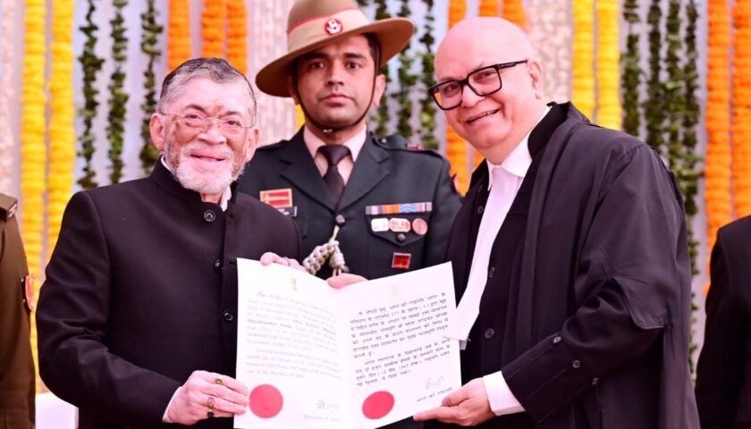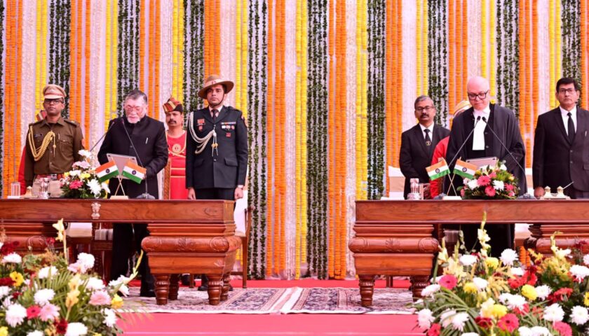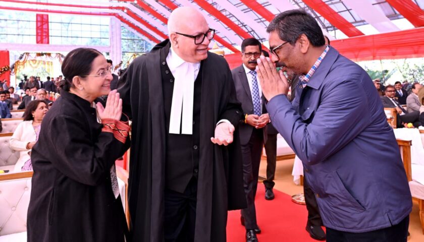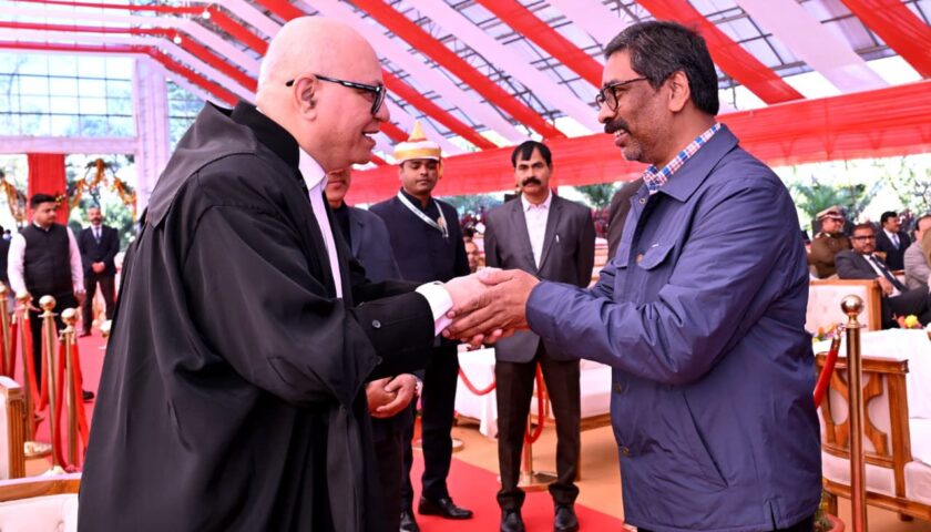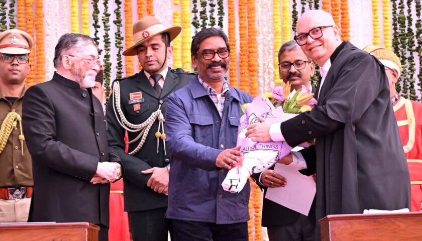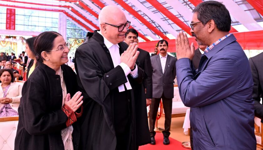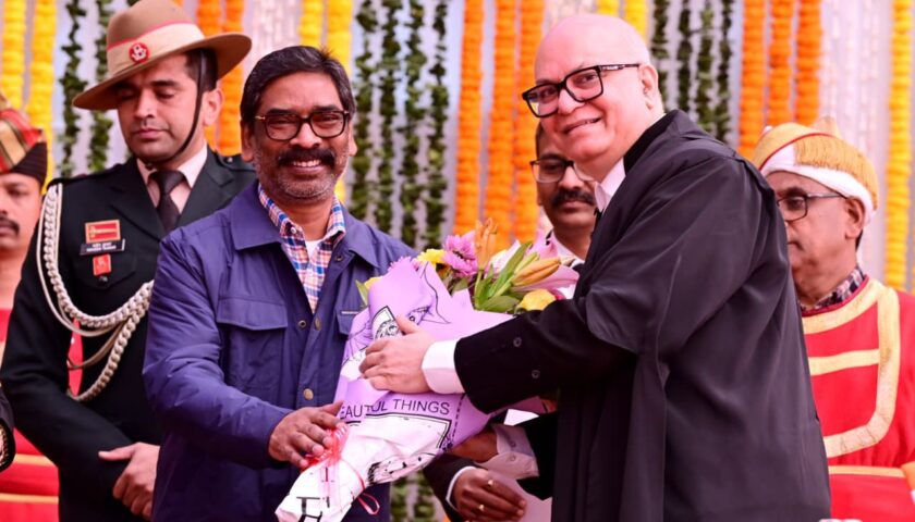 रांची : माननीय राज्यपाल संतोष कुमार गंगवार ने आज लोक भवन स्थित बिरसा मंडप में माननीय न्यायमूर्ति श्री महेश शरदचंद्र सोनक को झारखंड राज्य उच्च न्यायालय के मुख्य न्यायाधीश के पद की शपथ दिलाई। इस अवसर पर माननीय मुख्यमंत्री श्री हेमन्त सोरेन भी सम्मिलित हुए। शपथ ग्रहण के उपरान्त माननीय राज्यपाल श्री संतोष कुमार गंगवार एवं माननीय मुख्यमंत्री श्री हेमन्त सोरेन ने माननीय मुख्य न्यायाधीश श्री महेश शरदचंद्र सोनक को हार्दिक बधाई तथा शुभकामनाएँ दी।