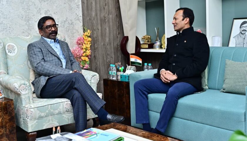 रांची। मुख्यमंत्री आवासीय कार्यालय में आज झारखंड के माननीय मुख्यमंत्री हेमंत सोरेन से कृषि, पशुपालन एवं सहकारिता विभाग की मंत्री शिल्पी नेहा तिर्की, पूर्णिया (बिहार) से लोकसभा सांसद पप्पू यादव तथा कुरुक्षेत्र (हरियाणा) से लोकसभा सांसद नवीन जिंदल ने शिष्टाचार मुलाकात की।