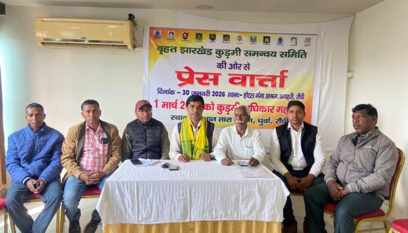 रांची। कुड़मी समाज की बहुप्रतीक्षित कुड़मी अधिकार महारैली अब 01 मार्च 2026 को आयोजित की जाएगी। यह जानकारी आज 30 जनवरी 2026 को होटल गंगा आश्रम, रांची में आयोजित प्रेस वार्ता के दौरान बृहत झारखंड कुड़मी समन्वय समिति के मुख्य संयोजक शीतल ओहदार ने दी।