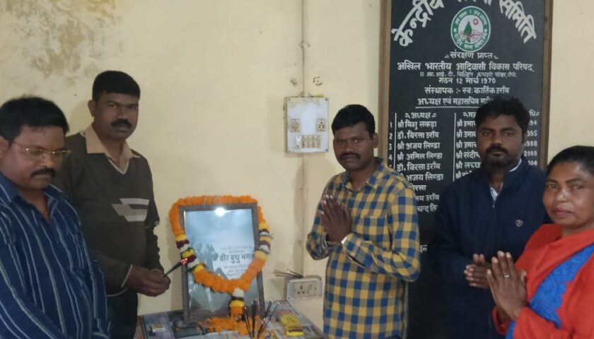 केंद्रीय सरना समिति द्वारा शुक्रवार को वीरता और बलिदान के प्रतीक महानायक वीर बुधु भगत की पुण्यतिथि श्रद्धापूर्वक मनाई गई। इस अवसर पर रांची स्थित केंद्रीय सरना समिति के केंद्रीय कार्यालय, 13 आरआईटी बिल्डिंग, कचहरी परिसर में उनके चित्र पर माल्यार्पण कर उन्हें श्रद्धांजलि अर्पित की गई।