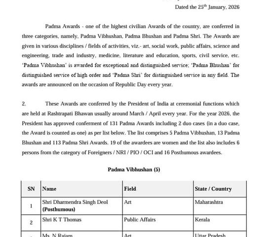 नई दिल्ली। राष्ट्रपति ने वर्ष 2026 के लिए कुल 131 पद्म पुरस्कार प्रदान करने की मंज़ूरी दे दी है। जारी सूची के अनुसार इस वर्ष पाँच पद्म विभूषण, 13 पद्म भूषण और 113 पद्म श्री पुरस्कार शामिल हैं।