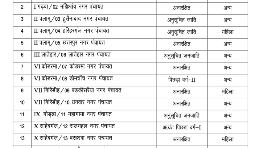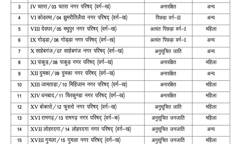 वहीं धनबाद नगर निगम के मेयर पद को अनारक्षित श्रेणी में रखा गया है। आयोग द्वारा जारी सूची में राज्य के सभी प्रमुख नगर निगमों के मेयर पद के लिए आरक्षण का स्पष्ट विवरण दिया गया है।