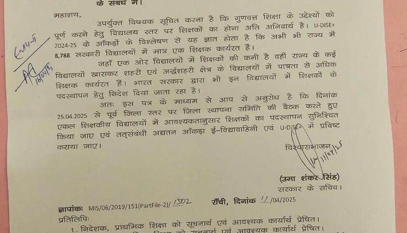 इस क्रम में मोर्चा के प्रदेश संयोजक अमीन अहमद एवं प्रदेश प्रवक्ता अरुण कुमार दास ने जानकारी देते हुए कहा कि स्कूली शिक्षा एवं साक्षरता विभाग, झारखंड सरकार के सचिव उमा शंकर सिंह के पत्रांक 1502 / दिनांक 11 अप्रैल 2025 के द्वारा राज्य के 8788 एकल शिक्षकीय विद्यालयों में शिक्षकों का पदस्थापन दिनांक 25 अप्रैल 2025 तक करने का विभागीय आदेश जारी किया गया था, परन्तु आज तक इसका अनुपालन नहीं हुआ है। इसके अतिरिक्त राज्य के अधिकांश सरकारी विद्यालयों में आर टी ई 2009 के अनुरूप छात्र : शिक्षक अनुपात (30 : 01) का अनुपालन आज तक नहीं किया गया है।