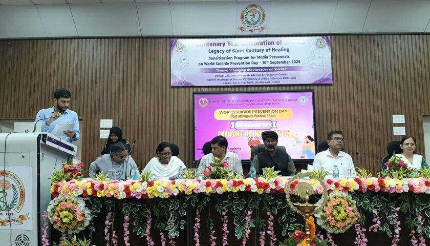 विश्व आत्महत्या रोकथाम दिवस के अवसर पर संस्थान के J.E. Dhunjibhoy Academic & Research Center, कांके, Ranchi में कार्यशाला का आयोजन प्रेस एवं मीडिया बंधुओं के लिए किया गया। स्वागत भाषण देते हुए संस्थान के निदेशक प्रोफेसर अमूल रंजन सिंह ने इस वर्ष के विश्व आत्महत्या रोकथाम दिवस के विषय “आत्महत्या पर दृष्टिकोण बदलें” पर बताया कि आत्महत्या को अपराध की श्रेणी से मुक्त कर कर दिया गया है और ऐसी गंभीर परेशानी से जूझ रहे लोगों को दण्ड से पुनर्वास की ओर स्थानांतरित करने की आवश्यकता पर बल दिया। उन्होंने प्रेस एवं मीडिया का इस प्रयास में अवियोज्य योगदान बताया।