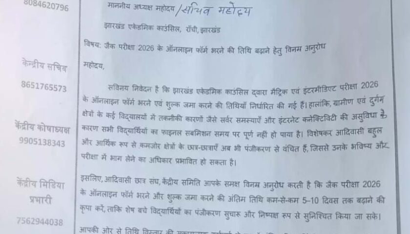 आदिवासी छात्र संघ ने JAC प्रशासन से मांग की है कि छात्र हित को सर्वोच्च प्राथमिकता देते हुए ऑनलाइन फॉर्म भरने एवं शुल्क जमा करने की अंतिम तिथि कम से कम 5 से 10 दिनों तक बढ़ाई जाए, ताकि सभी पात्र छात्र बिना किसी बाधा के बोर्ड परीक्षा 2026 में सम्मिलित हो सकें।