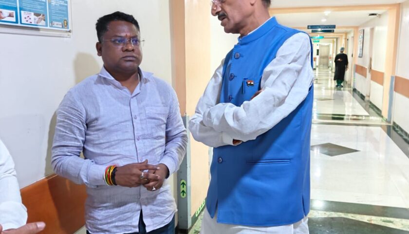 मंत्री रामदास सोरेन का हाल जानने दिल्ली पहुंचे केंद्रीय रक्षा राज्य मंत्री संजय सेठ।