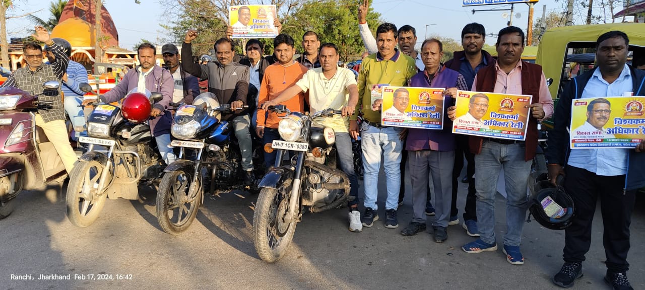 झारखंड प्रदेश विश्वकर्मा समाज प्रदेश कमिटी द्वारा आयोजित विश्वकर्मा अधिकार रैली के पूर्व संध्या में विश्वकर्मा समाज जिला कमिटी राँची के जिला अध्यक्ष संतोष कुमार जी के नेतृत्व में 400 मोटरसाईकिल के साथ पूरी राँची शहर में भ्रमण कर 18 फरवरी 2024 को राँची में आयोजित विश्वकर्मा अधिकार रैली में शामिल होने के लिए विश्वकर्मा बंधुओ को आमंत्रित किया गया।रैली का शुभारंभ जिला स्कूल ( शहीद चौक )से बिरसा चौक,अरगोड़ा,हरमू चौक,रातू रोड चौक,से मोरहाबादी मैदान में समापन हुई।